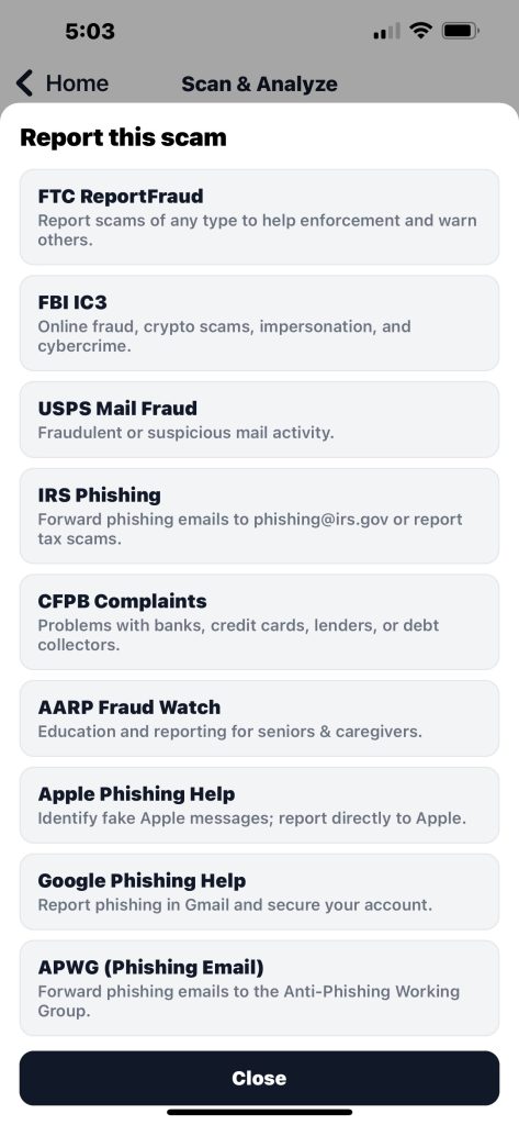 Report to local agencies by clicking on Report Scam in the Scan and Analyze page. Click on the Agency to report the scam you identified.